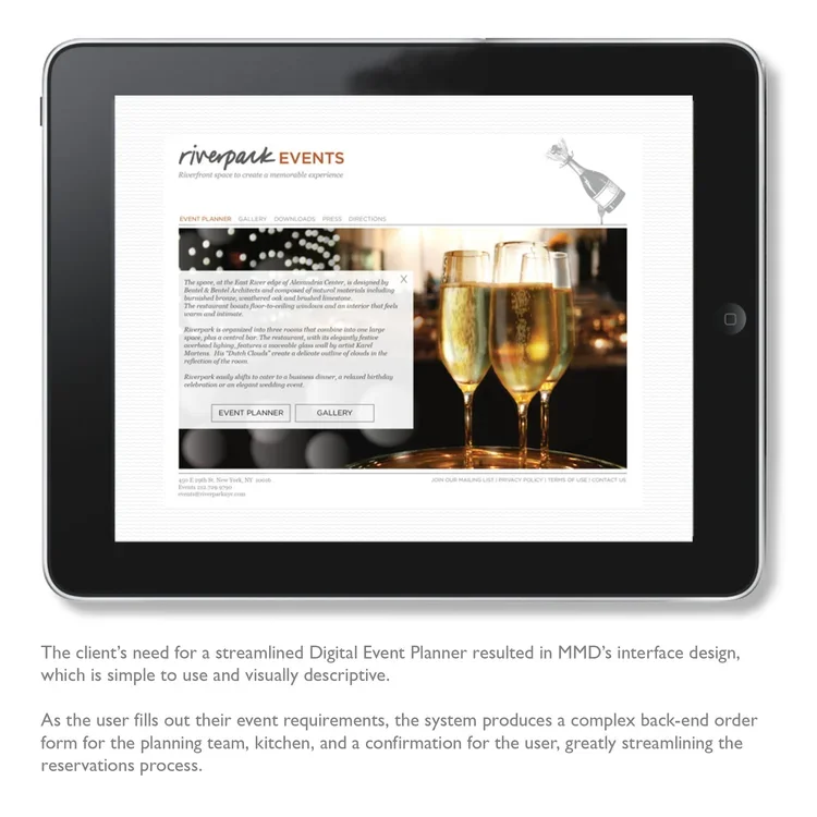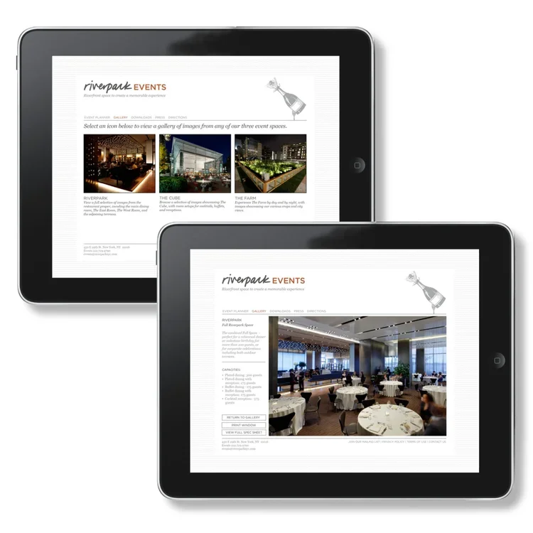 This restaurant overlooking the East River is the brainchild of Chefs Tom Colicchio and Sisha Ortúzar. The restaurant is part of a larger campus of indoor and outdoor spaces, including the main Riverpark restaurant, The Farm – New York’s largest outdoor urban farm, and The Cube – an airy modernist glass structure. The collection of spaces are used often for corporate and personal events—a core business for the restaurant campus as a whole.